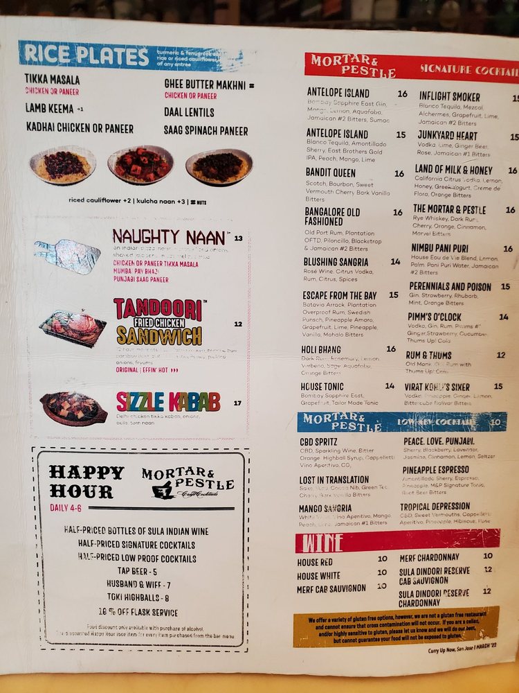Curry Up Now, located in San Jose, CA, offers a unique Indian dining experience with a focus on gluten-free and vegetarian options. With a diverse menu ranging from traditional dishes like Samosas and Lamb Bowls to innovative creations such as Indian-Chinese fusion items, this establishment truly stands out. Customers rave about the flavorful dishes, generous portions, and attentive service. The full bar, Mortar & Pestle, attached to the San Jose location adds an extra touch of excitement with strong cocktails like the Bangalore Old Fashioned and Inflight Smoker. The overall dining experience is elevated by the trendy and casual ambiance, making it perfect for groups or families looking to enjoy delicious food. Don't miss out on the Bhel Puri appetizer and the signature Mortar & Pestle drink for a truly memorable meal.