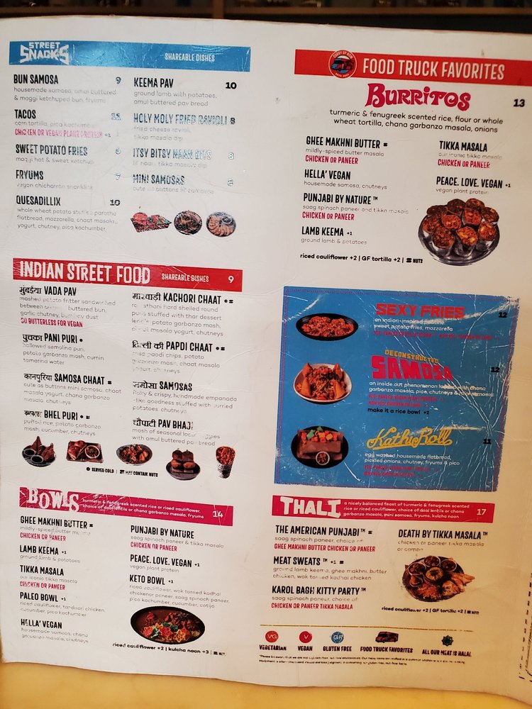 lil' samosas (V) chicken or paneer tikka masala saag paneer or chicken (VG) aloo gobi (V) daal lentils (V) mixed naan (VG) turmeric rice (V) cilantro chutney (V) tamarind chutney (V) pico kachumber (V) fryums (V) raita (VG) gulab jamun...
